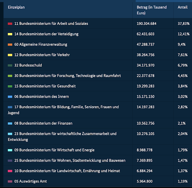 Den höchsten Posten hat "Soziales", der höchste Einzelposten sind mit 140 Mrd. Zuschüsse zur Rente. Interessant die Aufschlüsselung, in der sich der Bundeszuschuss zum Bürgergeld verbirgt. Hierzu muss man noch Unterkunft- und Heizkosten addieren um auf die Gesamtsumme von 40 Mrd. zu kommen. Und das sind nur die Zuschüsse vom Bund. Länder und Kommunen tragen hier auch noch Kosten.